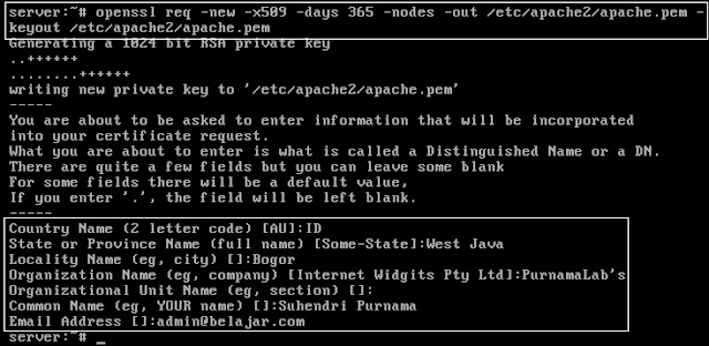 - Pada bagian ini kita akan membuat RSA key dan SSL Certificate yang berfungsi sebagai identitas server ketik #openssl req -new -x509 -days 365 -nodes -out /etc/apache2/apache.pem -keyout /etc/apahce2/apache.pem
